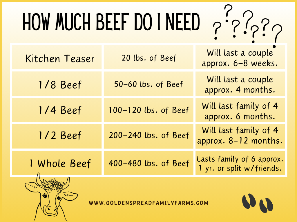 This guide will give you a general idea of how much Beef to order to meet the needs of your family.