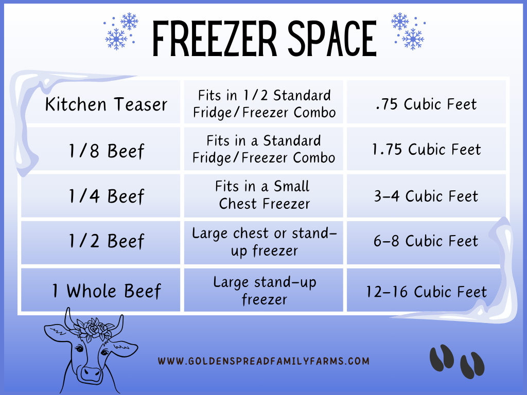 - 1/4 Beef - 3-4 cubic feet of freezer space (It will fit in a small chest freezer.)