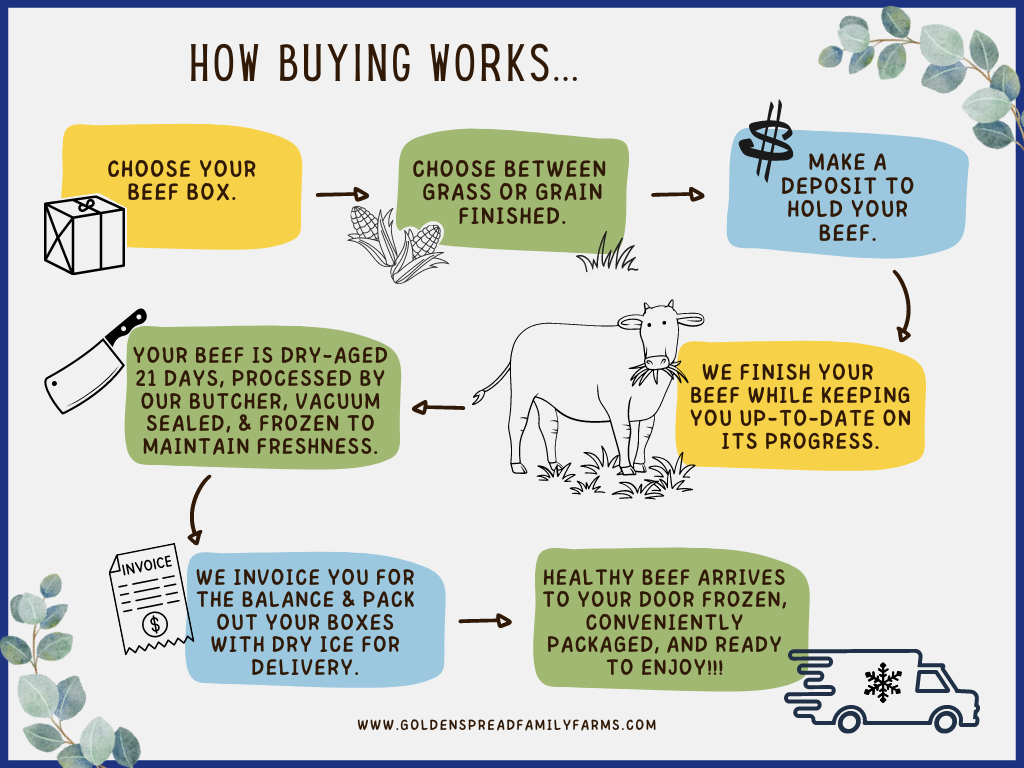 - Place your order and pay your deposit today to hold your Beef for this season! We will keep you updated while we finish your Beef. Once it is ready to ship, we'll reach out to coordinate your shipping time and send you an invoice for the remaining balance after we receive the final processing weight. You'll be amazed at how simple buying healthy Beef straight from our family farm really is!